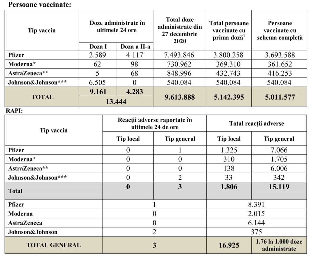 13.444 de persoane au fost vaccinate anti-COVID în ultimele 24 de ore, dintre care 9.161 cu prima doză, potrivit datelor furnizate de CNCAV.