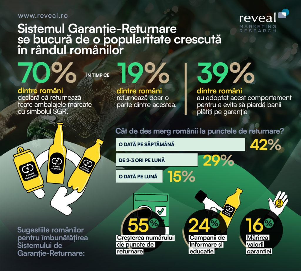 Cel mai recent studiu derulat de Reveal Marketing Research și-a propus să afle mai multe detalii despre atitudinile și comportamentele românilor în ceea ce privește Sistemul de Garanție-Returnare a ambalajelor băuturilor îmbuteliate, care a devenit funcțional începând cu sfârșitul anului trecut (30 noiembrie 2023).