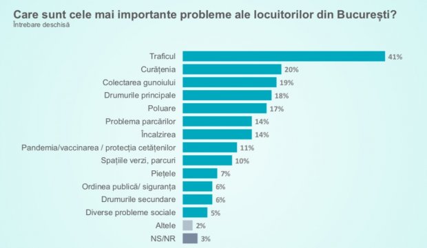 De asemenea, întrebați despre cele mai importante probleme din Capitală, bucureștenii amintesc de trafic, curățenie și colectarea deșeurilor, arată sondajul CURS efectuat luna aceasta.