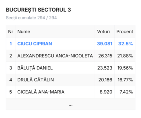 Ciprian Ciucu, candidatul Partidului Național Liberal, a obținut 39.081 voturi (32,5%), în Sectorul 3 al Capitalei, la alegerile locale parțiale organizate duminică pentru funcția de primar general al municipiului București, arată datele publicate, în timp real, pe site-ul Autorității Electorale Permanente, după centralizarea voturilor din toate secțiile de pe raza sectorului, adică 294 de secții.