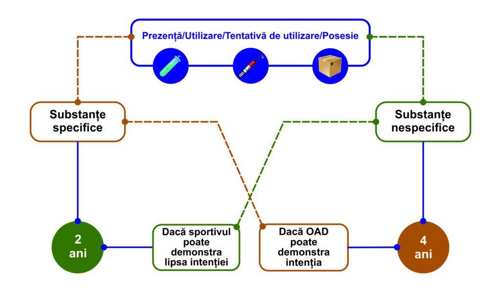 Pentru o substanţă specifică, perioada de suspendare este de 2 ani, cu excepţia cazului în care organizaţia antidoping poate dovedi că utilizarea sa a fost intenţionată. Intenţia directă: sportivul ştia că acţiunile sale reprezentau o încălcare a reglementărilor antidoping. În practică, acest lucru este foarte dificil de dovedit. Chiar şi atunci când o substanţă interzisă este înscrisă pe recipientul suplimentului sau al medicamentului, un sportiv poate pretinde că a fost ignorant, mai ales dacă acest lucru este susţinut de dovada lipsei de educaţie. Dar, intenţia directă poate fi, de asemenea, dedusă în anumite cazuri, cum ar fi cele care implică paşaportul biologic al sportivului (ABP).