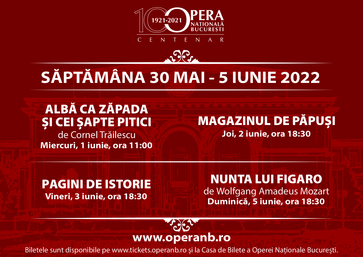 Opera Națională București prezintă spectacolele de balet pentru copii „Albă ca zăpada și cei șapte pitici” de Cornel Trăilescu și „Magazinul de păpuși” cu ocazia Zilei Internaționale a Copilului și spectacolul cu opera „Nunta lui Figaro” de Wolfgang Amadeus Mozart.