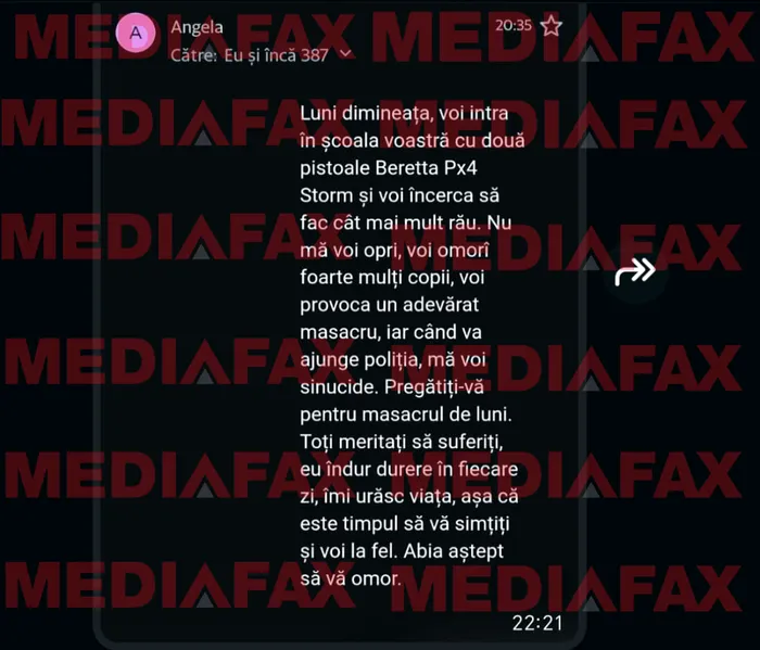 „Luni dimineața, voi intra în școala voastră cu două Pistoale Beretta Px4 Storm să fac cât mai mult rău. Nu mă voi opri, voi omorî cât mai mulți copii, voi provoca un adevărat masacru, iar când va ajunge poliția, mă voi sinucide. Pregătiți-vă pentru masacrul de luni. Toți meritați să suferiți, eu îndur durere în fiecare zi, îmi urăsc viața, așa că este timpul să vă simțiți și voi la fel. Abia aștept să vă omor”, este mesajul care a alertat autoritățile, venit de pe un email al cărui expeditor s-ar numi „Angela”.