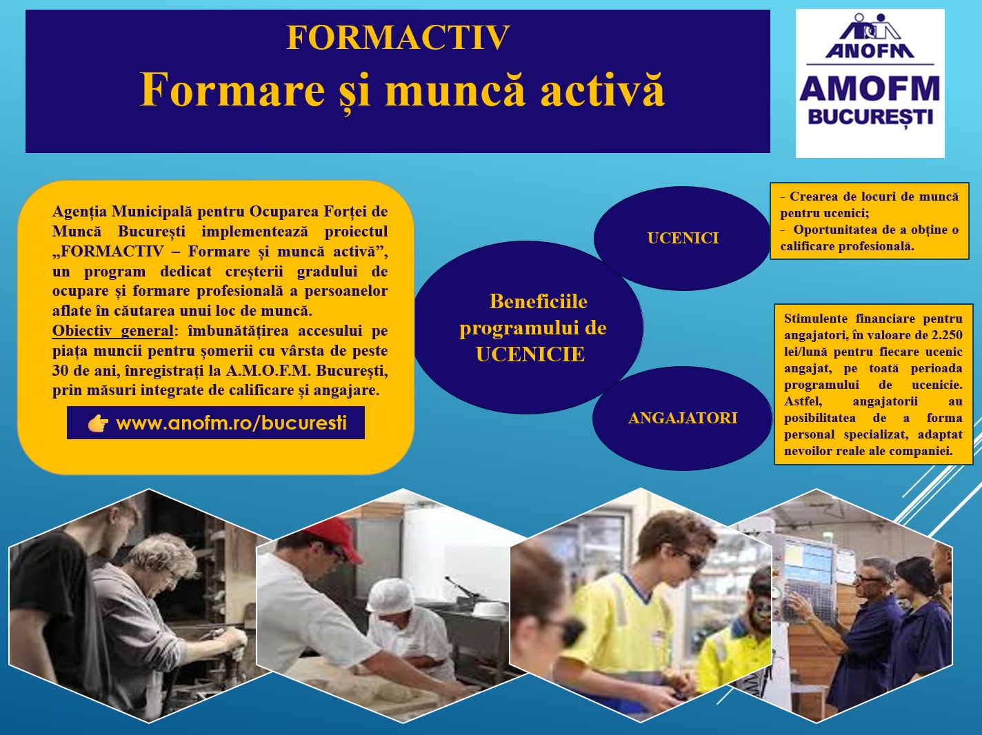 Agenția Municipală pentru Ocuparea Forței de Muncă (AMOFM) București implementează, în perioada 24 decembrie 2024 – 23 decembrie 2029, proiectul ‘FORMACTIV – Formare și muncă activă’, cu obiectivul general de creștere a oportunităților de încadrare a șomerilor înregistrați la Serviciul Public de Ocupare (SPO), informează, vineri, instituția, printr-un comunicat.