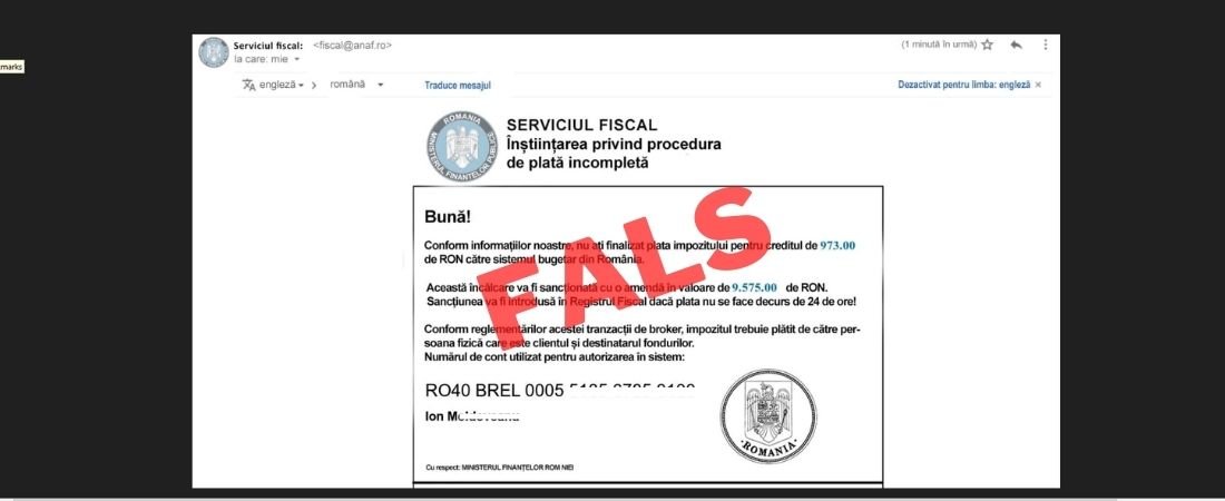 Agenţia Naţională de Administrare Fiscală (ANAF) avertizează asupra unor mesaje false transmise în numele instituţiei prin care contribuabilii sunt anunţaţi că au de plătit impozite către sistemul bugetar din România.
