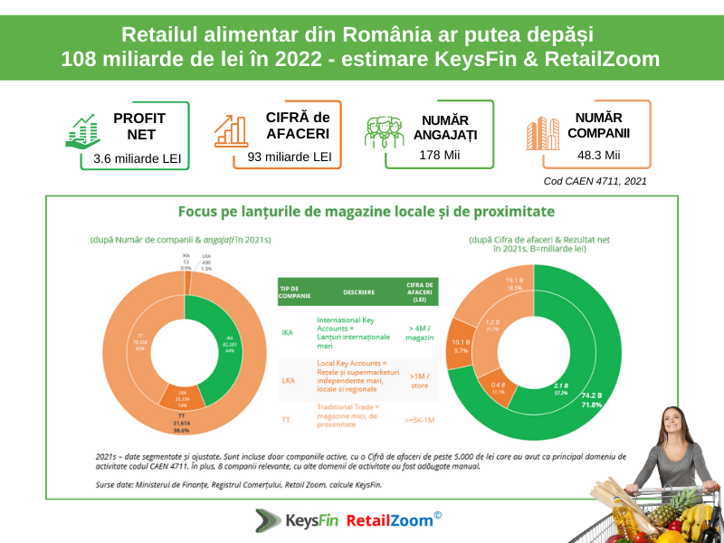 Retailul alimentar din România ar putea depăşi 108 miliarde de lei în 2022 pe fondul avansului consumului, dar mai ales al accentuării presiunilor inflaţioniste, arată o analiză realizată de KeysFin & RetailZoom.