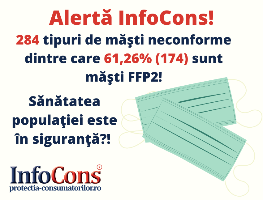 InfoCons a transmis, joi, o nouă alertă privind măștile neconforme: sunt 284 de tipuri de măști neconforme, dintre care 61,26%, respectiv 174 sunt măști FFP2.