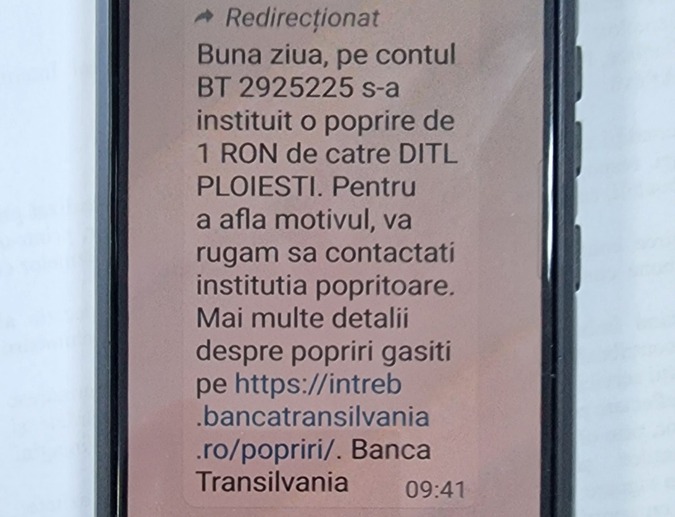 Acesta este SMS-ul primit pe telefon de mai mulți oameni: „Bună ziua, pe contul BT 2925225 s-a instituit o poprire de 1 RON de către DITL PLOIESTI. Pentru a afla motivul vă rugam să contactați instituția popritoare. Mai multe detalii despre popriri găsiți pe intreb.bancatransilvania.ro. Banca Transilvania”.
