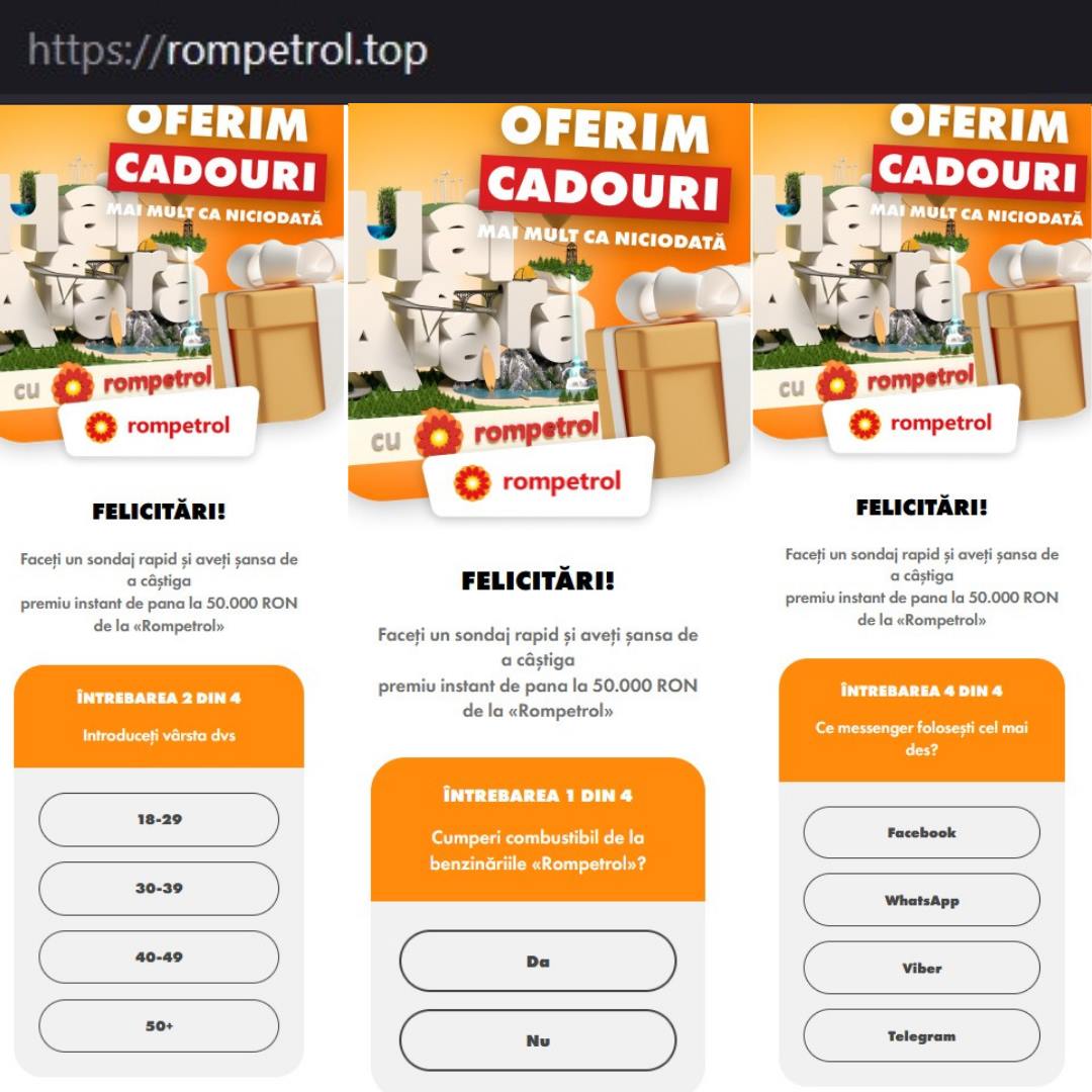 Sub pretextul posibilității de a câștiga un premiu sau un voucher de cumpărături, utilizatori din România primesc (pe social media sau aplicații de mesagerie) mesaje cu link-uri către site-uri compromise unde se prezintă oferte promoționale false.