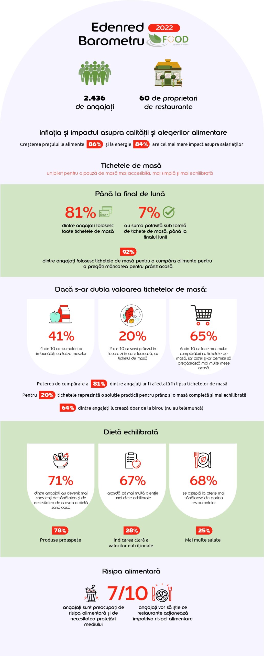„Perioada pe care o traversăm continuă să fie dificilă din punct de vedere socio-economic, iar efectele se resimt prin creșterile de cost repetate. Impactul este cel mai vizibil în coșul de cumpărături. Rezultatele Barometru FOOD confirmă faptul că beneficiul nr. 1 în preferințele angajaților – cardul de masă este un instrument care îi ajută pe aceştia să își mențină puterea de cumpărare, mai mult decât oricând. Totodată, raportul indică și o preocupare în creștere, în rândul salariaţilor, pentru adoptarea unui stil de viață sănătos și orientarea către o dietă echilibrată. Această preocupare se reflectă și la nivelul restaurantelor, în modul în care operatorii își adaptează lanțul de aprovizionare, sistemul de organizare și oferta”, a declarat Ana Busuioc, Legal & Public Affairs Director Edenred România.