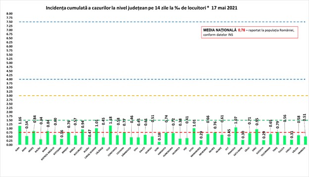 Coeficientul infectărilor cumulate la 14 zile, raportate la 1.000 de locuitori este calculat de către Direcțiile de Sănătate Publică, la nivelul Municipiului București și al județelor. Mai jos aveți graficul realizat în baza raportărilor primite de CNCCI de la Direcțiile de Sănătate Publică: