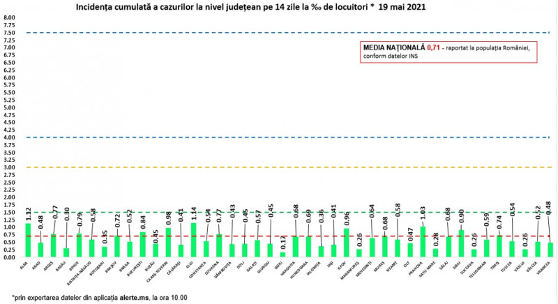 Coeficientul infectărilor cumulate la 14 zile, raportate la 1.000 de locuitori este calculat de către Direcțiile de Sănătate Publică, la nivelul Municipiului București și al județelor. Mai jos aveți graficul realizat în baza raportărilor primite de CNCCI de la Direcțiile de Sănătate Publică: