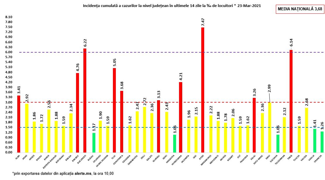 Coeficientul infectărilor cumulate la 14 zile, raportate la 1.000 de locuitori este calculat de către Direcțiile de Sănătate Publică, la nivelul Municipiului București și al județelor. Mai jos aveți graficul realizat în baza raportărilor primite de CNCCI de la Direcțiile de Sănătate Publică: