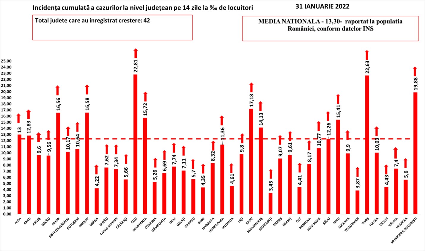 În intervalul 30.01.2022 (10:00) – 31.01.2022 (10:00) au fost raportate de către INSP 41 de decese (23 bărbați și 18 femei), ale unor pacienți infectați cu noul coronavirus, internați în spitalele din Arad, Botoșani, Brăila, Brașov, Caraș-Severin, Cluj, Dâmbovița, Dolj, Gorj, Harghita, Maramureș, Mehedinți, Neamț, Satu Mare, Sălaj, Sibiu, Suceava, Tulcea și Vaslui.