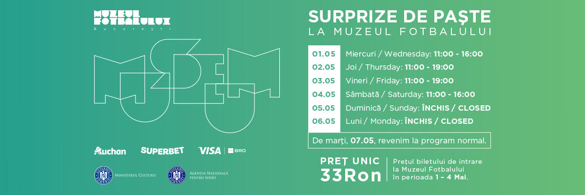 Cu ocazia vacanței de Paște, vizitatorii vor beneficia, în perioada 1-4 mai, de o experiență de neuitat la Muzeul Fotbalului la prețul unic al biletului de intrare de 33 lei.