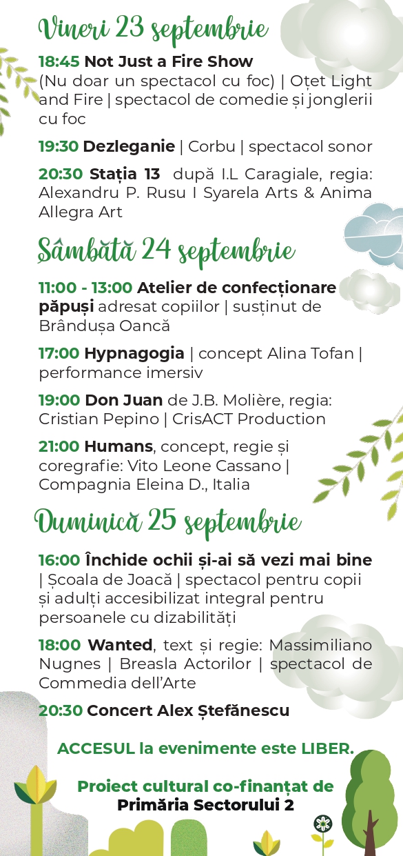 Teatru clasic, acrobații aeriene, jonglerii cu foc, spectacol pentru copii și adulți accesibilizat integral pentru persoane cu handicap, dans și concerte în aer liber îi așteptă pe bucureșteni într-un spațiu deschis tuturor, unde bucuria de a fi împreună și legătura dintre artiști și spectatori sunt vii și intense: