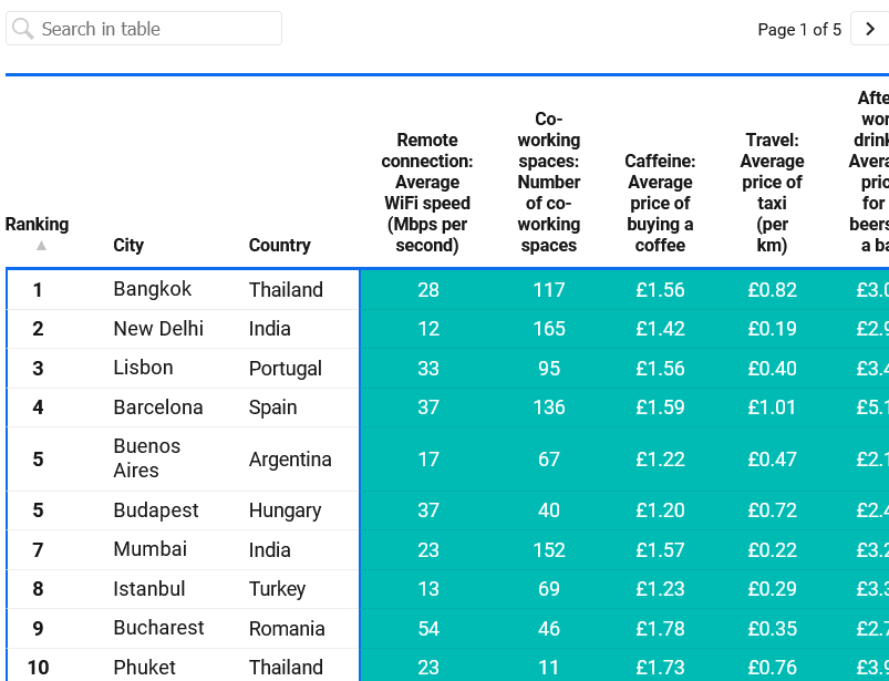 Indexul se calculează după costul cu chiria lunară la un apartament de două camere, numărul de activități de peste 4 stele pe care le poți face, costul băuturilor în oraș, numărul mediu de ore însorite și, cel mai important, viteza internetului Wi-fi.
