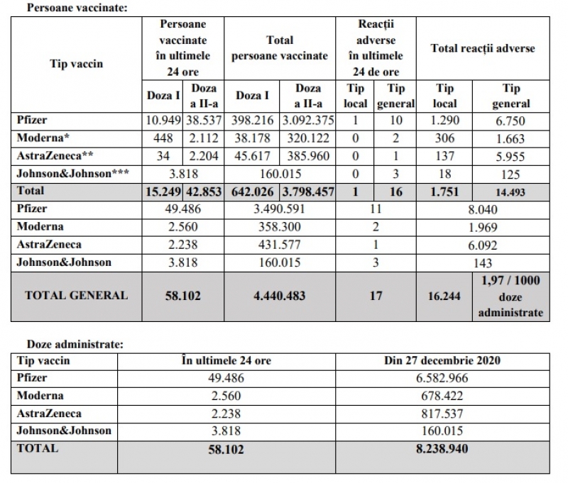 În ceea ce privește numărul total de reacții adverse înregistrate la nivelul centrelor de vaccinare, începând din 27 decembrie 2020, sunt 16.244 de reacții comune și minore.