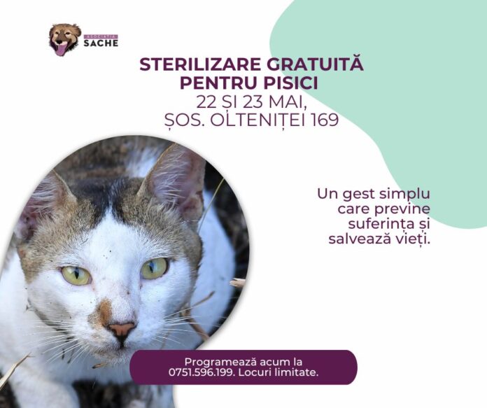 Asociația Sache Vet, în parteneriat cu ASPA București, organizează o nouă campanie de sterilizare gratuită pentru pisici în zilele de 22 și 23 mai, în zona Șoseaua Olteniței nr. 169, Sector 4.