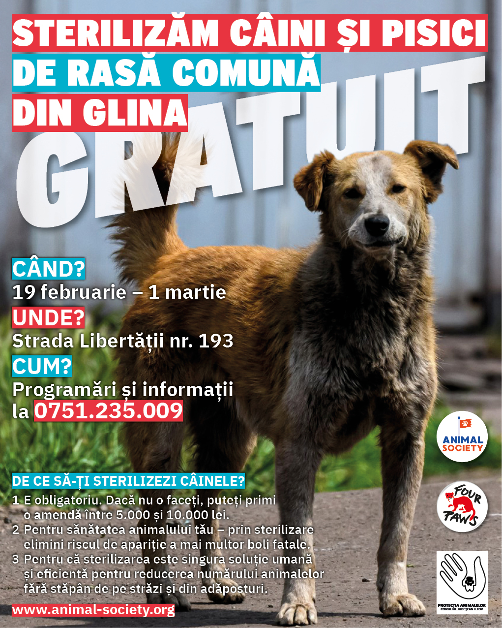 Animal Society şi Four Paws International anunță printr-un comunicat de presă că, în colaborare cu Consiliul Judeţean Ilfov, desfășoară o nouă campanie de sterilizări gratuite pentru câinii şi pisicile din Glina, între 19 februarie şi 1 martie.