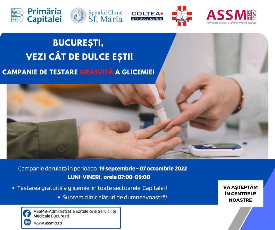 Administrația Spitalelor și Serviciilor Medicale București (ASSMB) împreună cu Spitalul Clinic „Sf. Maria”, Spitalul Clinic Colțea și Spitalul Clinic „Nicolae Malaxa”, cu sprijinul Primăriei Capitalei și al celor șase primării de sector, a ințiat luni cea mai amplă campanie de testare gratuită a glicemiei, „București, vezi cât de dulce ești”, anunță PMB.