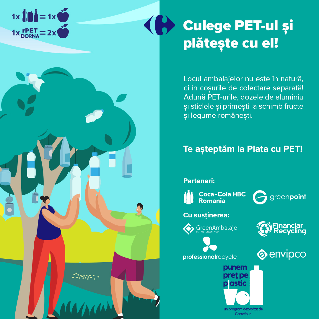 Plata cu PET a fost lansată în premieră, în anul 2019, de Carrefour România, ca parte din programul de economie circulară Punem Preț pe Plastic. Astfel, în primele trei ediții au fost colectate peste 750.000 de PET-uri și au fost date la schimb peste 120 de tone de fructe și legume românești, în 35 de hipermarketuri din țară.