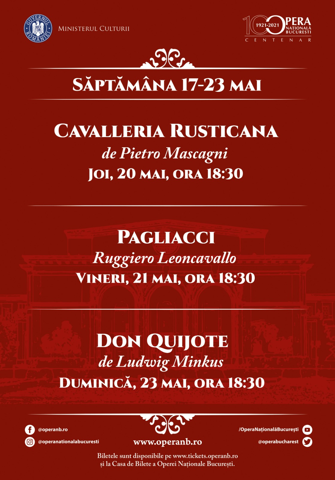 Vineri, 21 mai, de la aceeaşi oră, Opera Naţională Bucureşti prezintă spectacolul de operă „Pagliacci”, regizat tot de Ion Caramitru, cu Ciprian Teodoraşcu la pupitru. Ca răspuns pentru succesul răsunător al operei „Cavalleria Rusticana” scrisă de Mascagni, Leoncavallo a decis să scrie opera „Pagliacci”, tot într-un singur act. Povestea operei se bazează pe un incident real din copilăria compozitorului, de aceea opera la început purta titlul de “Il pagliaccio” (clovnul). Cel care a cerut schimbarea titlului a fost baritonul Victor Maurel, acesta dorind ca atenţia conflictului dramatic să îl includă atât pe Canio cât şi pe Tonio (propriul său rol).