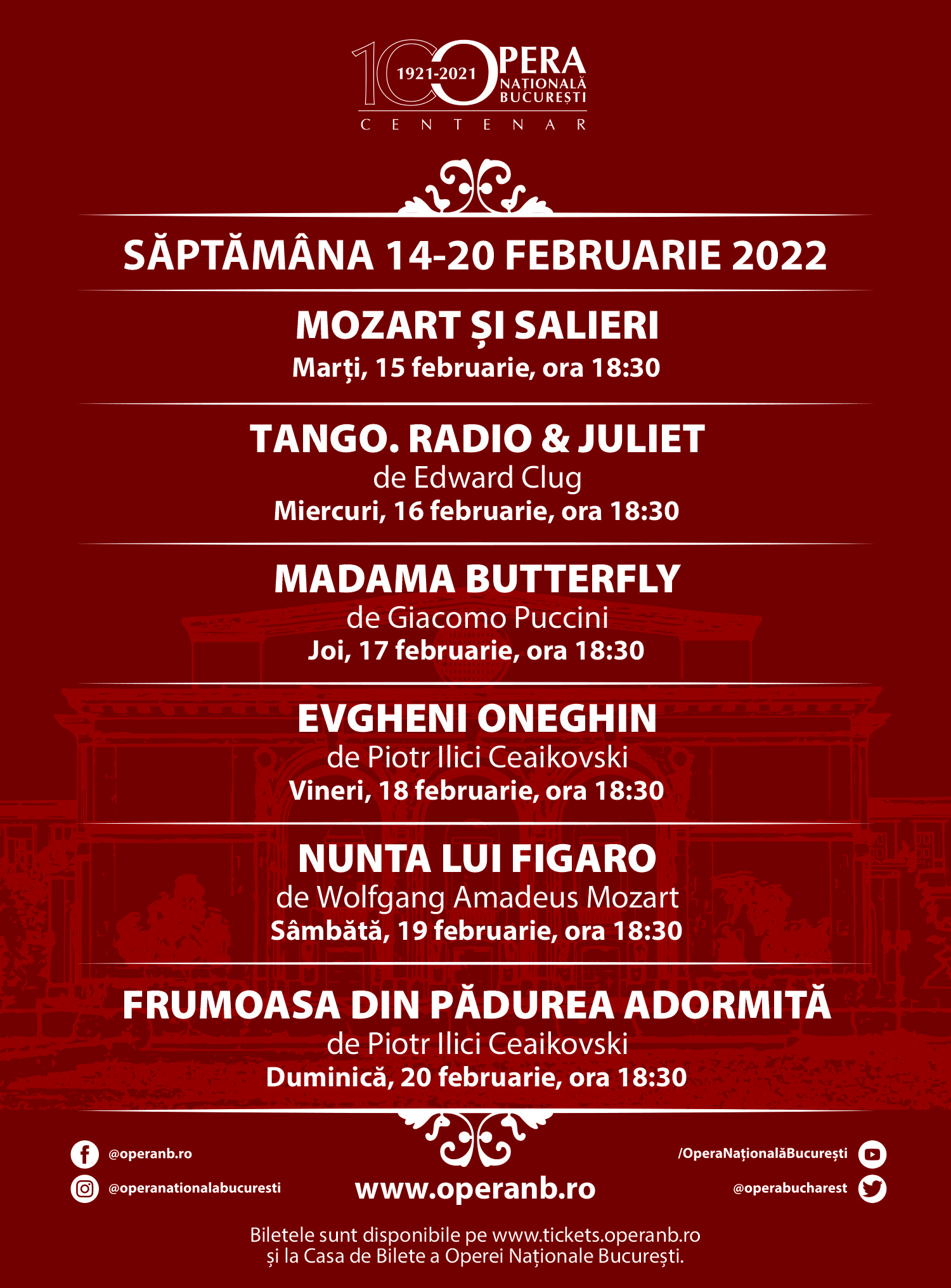 Spectacolul de foaier „Mozart și Salieri”, spectacolele de operă „Madama Butterfly” de Puccini, „Evgheni Oneghin” de Ceaikovski, „Nunta lui Figaro” de Mozart, spectacolul coupé de dans contemporan „Tango. Radio & Juliet” de Edward Clug și spectacolul de balet „Frumoasa din Pădurea Adormită” de Ceaikovski sunt spectacolele pe care le puteți urmări în această săptămână în Sala Mare de la ONB, toate făcând parte din repertoriul actual.
