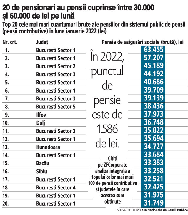 Cele mai mari 100 de pensii din România variază între 20.000 și 60.000 de lei pe lună, informează Ziarul Financiar.