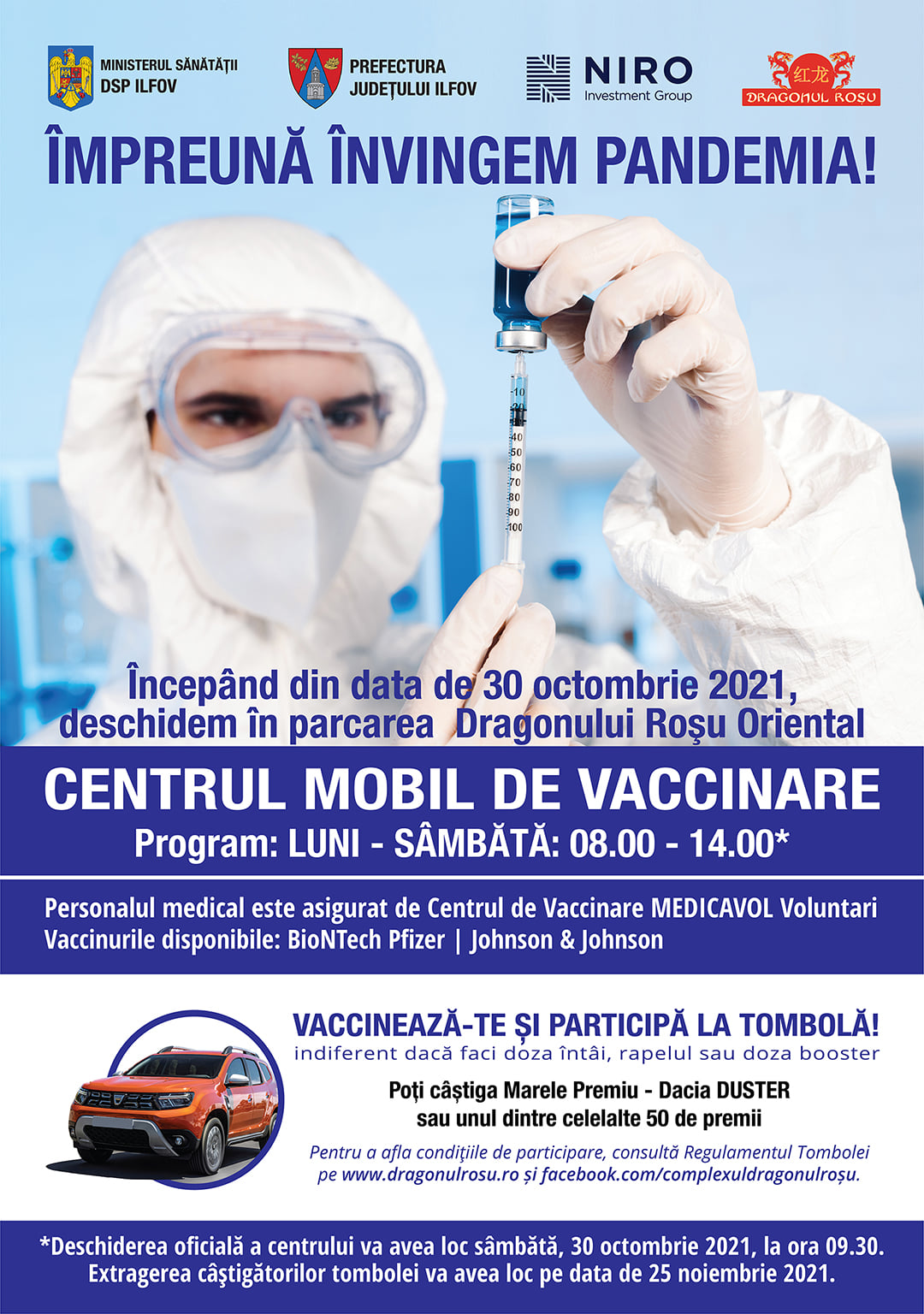 ”Administraţia Centrului Comercial Dragonul Roşu, parte a grupului de firme Niro Investment, a decis deschiderea unui punct de vaccinare anticovid în parcarea Dragonului Roşu Oriental. Acesta va fi deschis publicului sâmbătă, 30 octombire, ora 09:30.”, anunţă reprezentanţii centrului comercial.