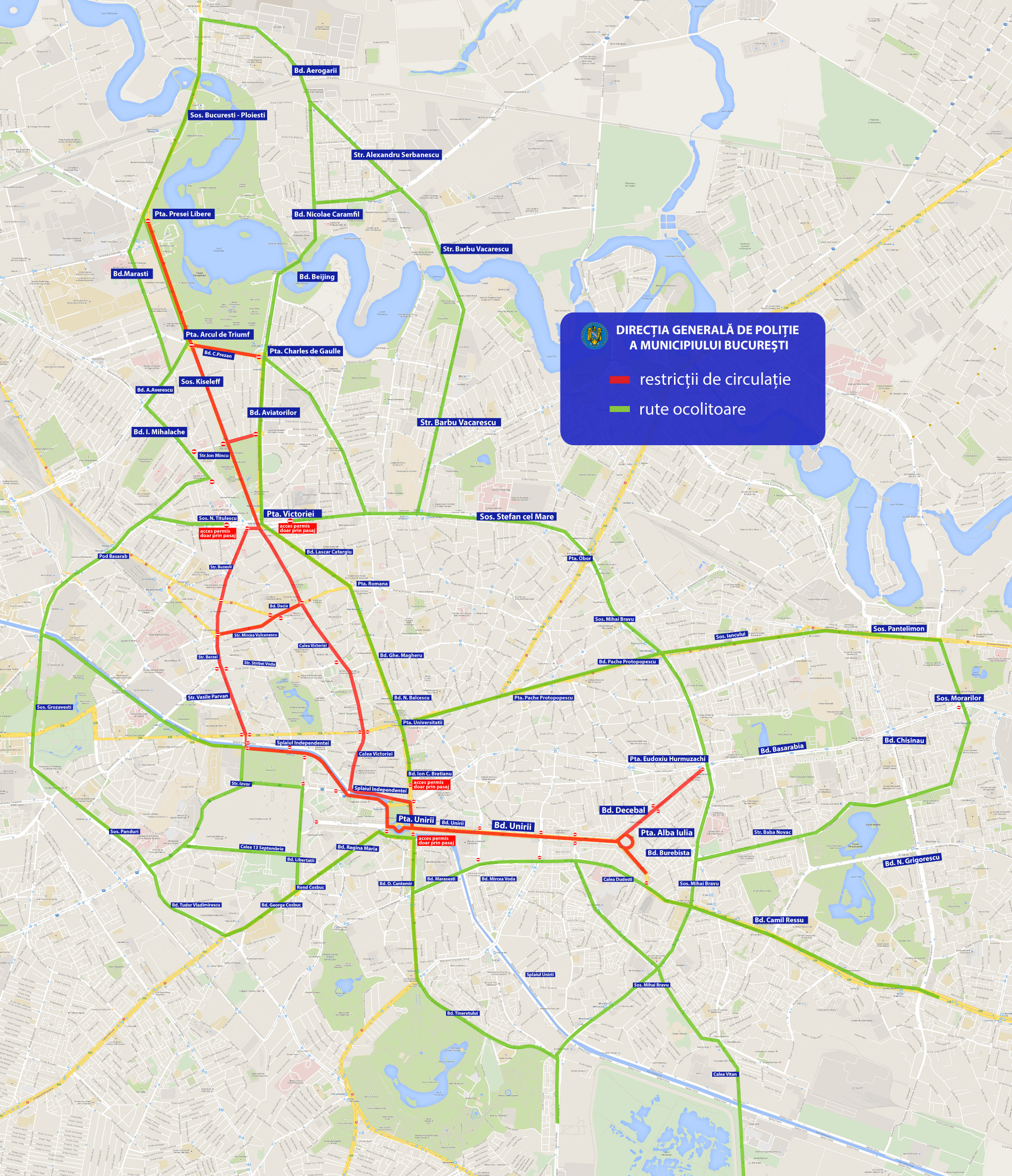 În Piața Victoriei va fi resistematizată circulația, prin asigurarea traficului rutier pe două benzi de circulație în fața Guvernului României în intervalul 07.00- 14.00, astfel nu va fi permis accesul dinspre Șos. Nicolae Titulescu către PiațaVictoriei.