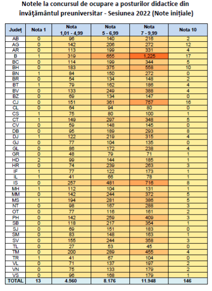 - În centrele de evaluare au fost notate 24.843 de lucrări, iar 19 lucrări au fost anulate în centrele de evaluare din motive care vizează nerespectarea metodologiei. Candidaţii eliminaţi pentru fraudă sau tentativă de fraudă nu vor fi repartizaţi/nu vor putea ocupa posturi didactice/catedre în anul școlar 2022 – 2023.
