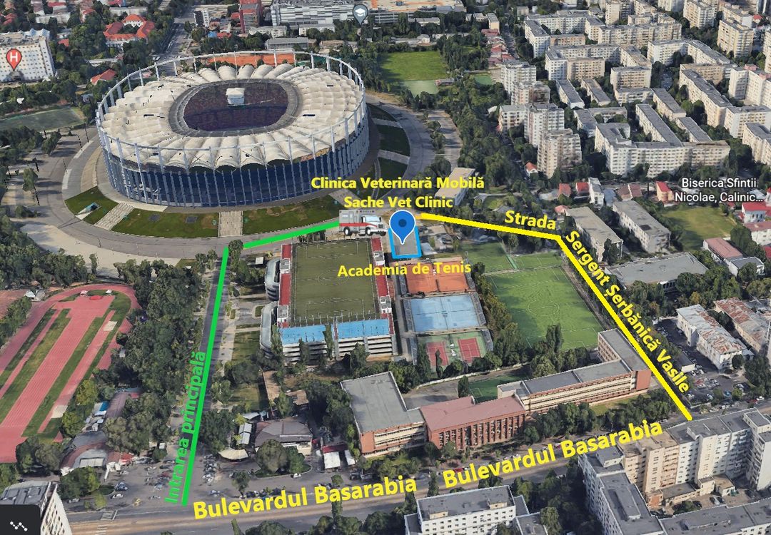- În zilele de 3 și 6 noiembrie, atunci când au loc două meciuri de fotbal la Arena Națională, accesul la clinica veterinară mobilă se va face din strada Sergent Șerbănică Vasile, conform traseului cu galben de pe hartă.