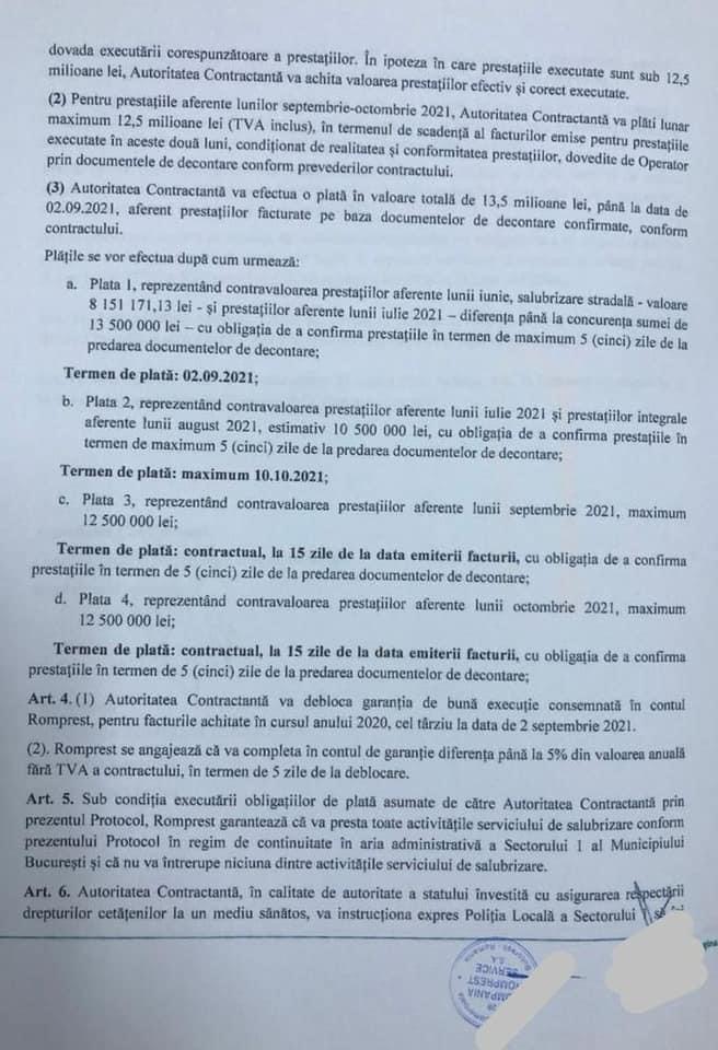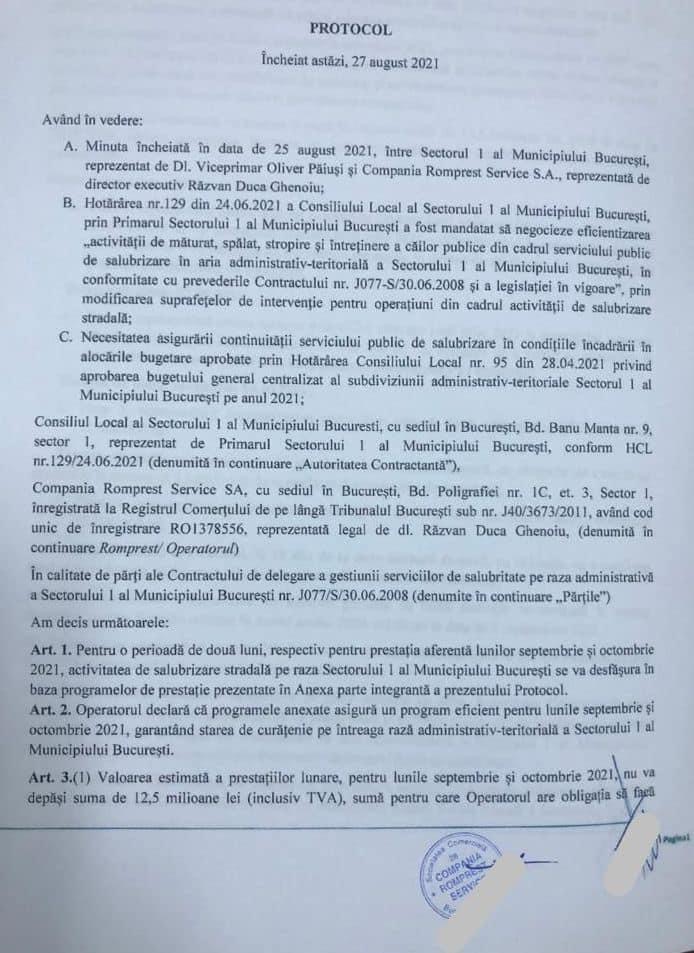 ”Valoarea estimată a prestațiilor lunare (ale Romprest pentru curățenia stradală din sector – n.red.) nu va depăși suma de 12,5 milioane de lei (inclusiv TVA) sumă pe care operatorul are obligația să facă dovada executării corespunzătoare a prestațiilor”, se arată în textul protocolului semnat de Primăria Sectorului 1 și Romprest SA și publicat de Clotilde Armand pe Facebook.