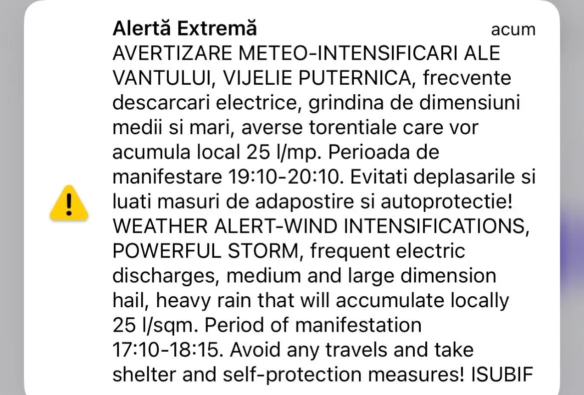 A fost emis și un mesaj RO-Alert de vijelie puternică.