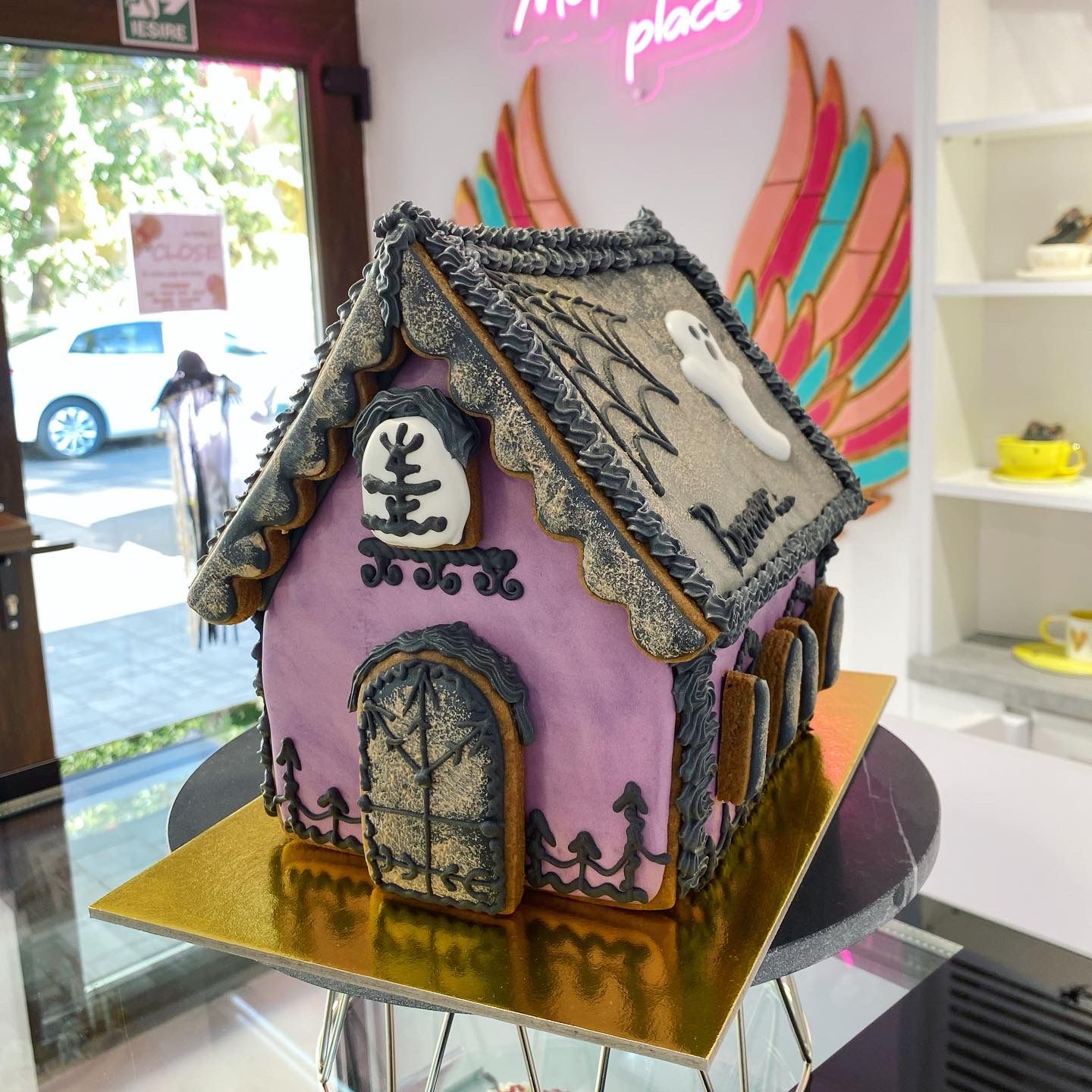 Tot în cofetărie există un colț pentru fotografii preferat de clienți, unde pe un perete se află o pereche de aripi din turtă dulce.