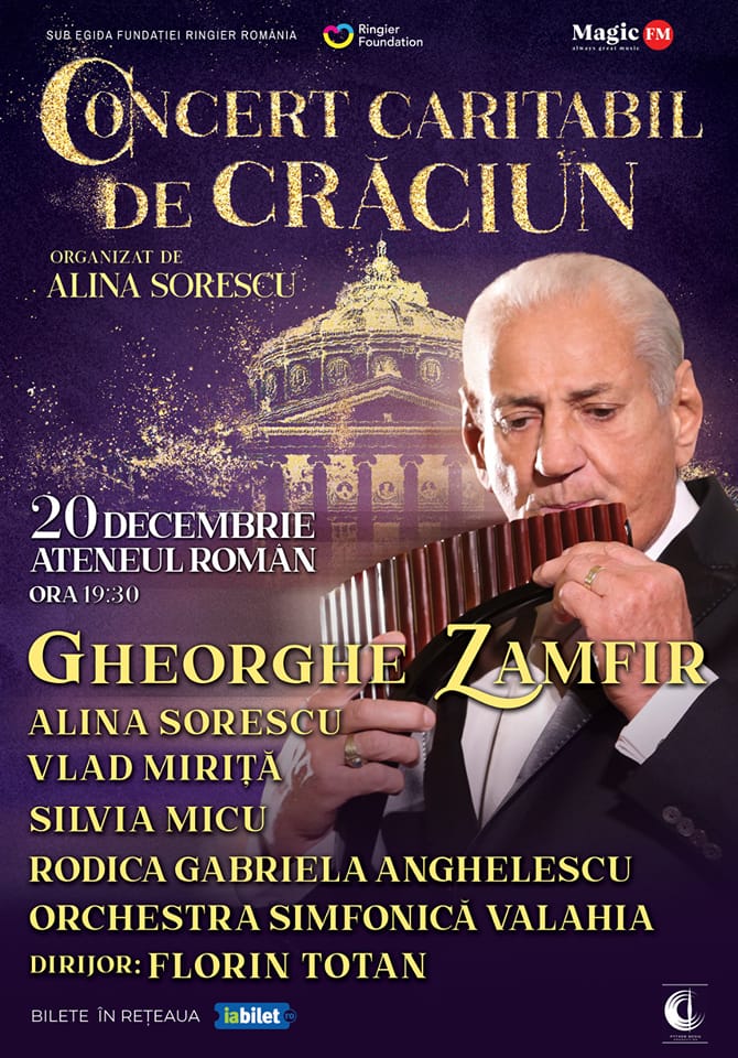Ambasadorul naiului, maestrul Gheorghe Zamfir, solista Alina Sorescu, tenorul Vlad Miriță, sopranele Silvia Micu și Rodica Gabriela Anghelescu în acompaniamentul Orchestrei Simfonice Valahia sub bagheta dirijorului Florin Totan vor încânta audiența de la Ateneul Român printr-un spectacol de înaltă ținută, momente muzicale pline de emoție și interpretări variate ale unor melodii de Crăciun din repertoriul internațional sau colinde tradiționale românești,  în armonie perfectă cu atmosfera de sărbătoare.