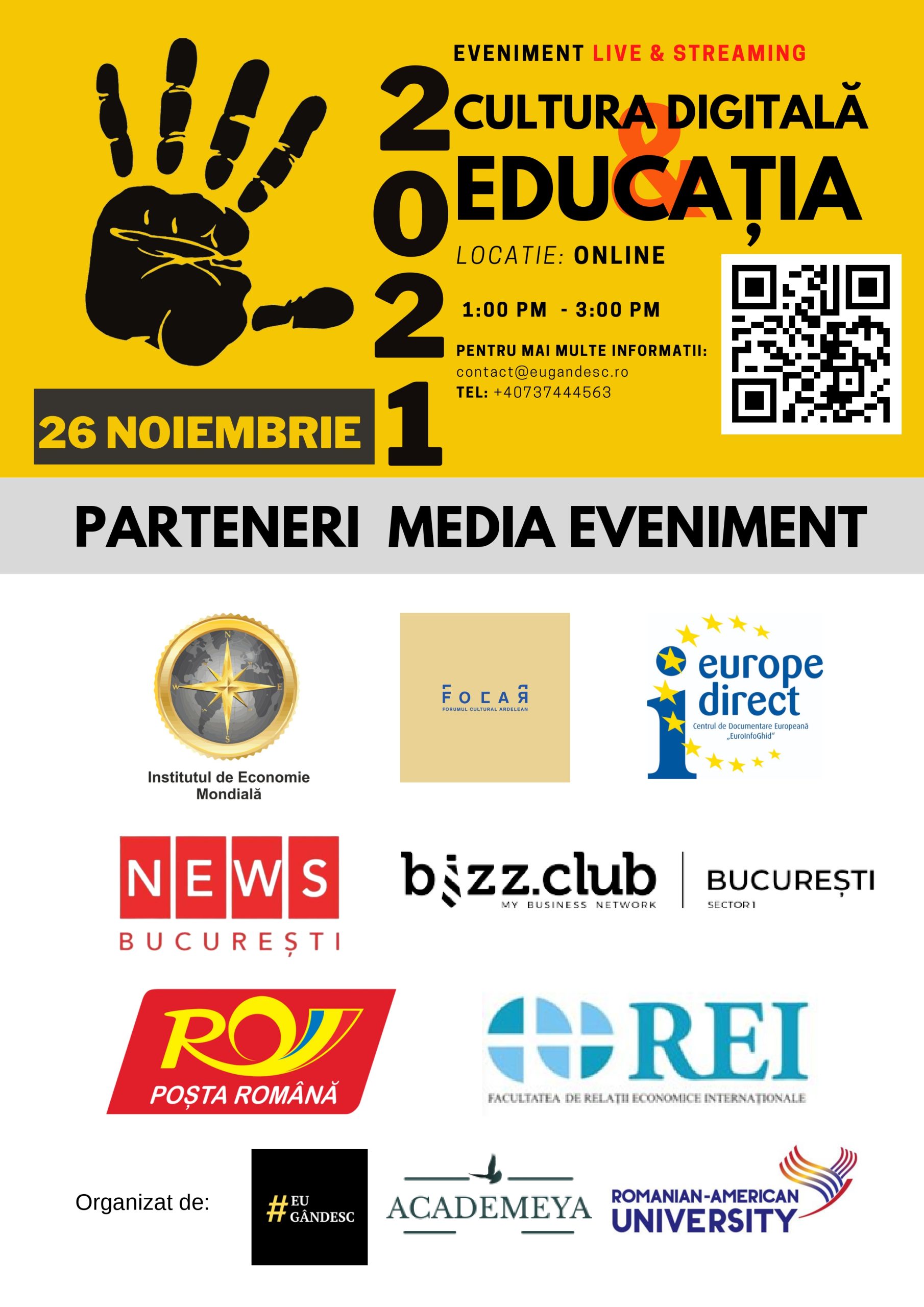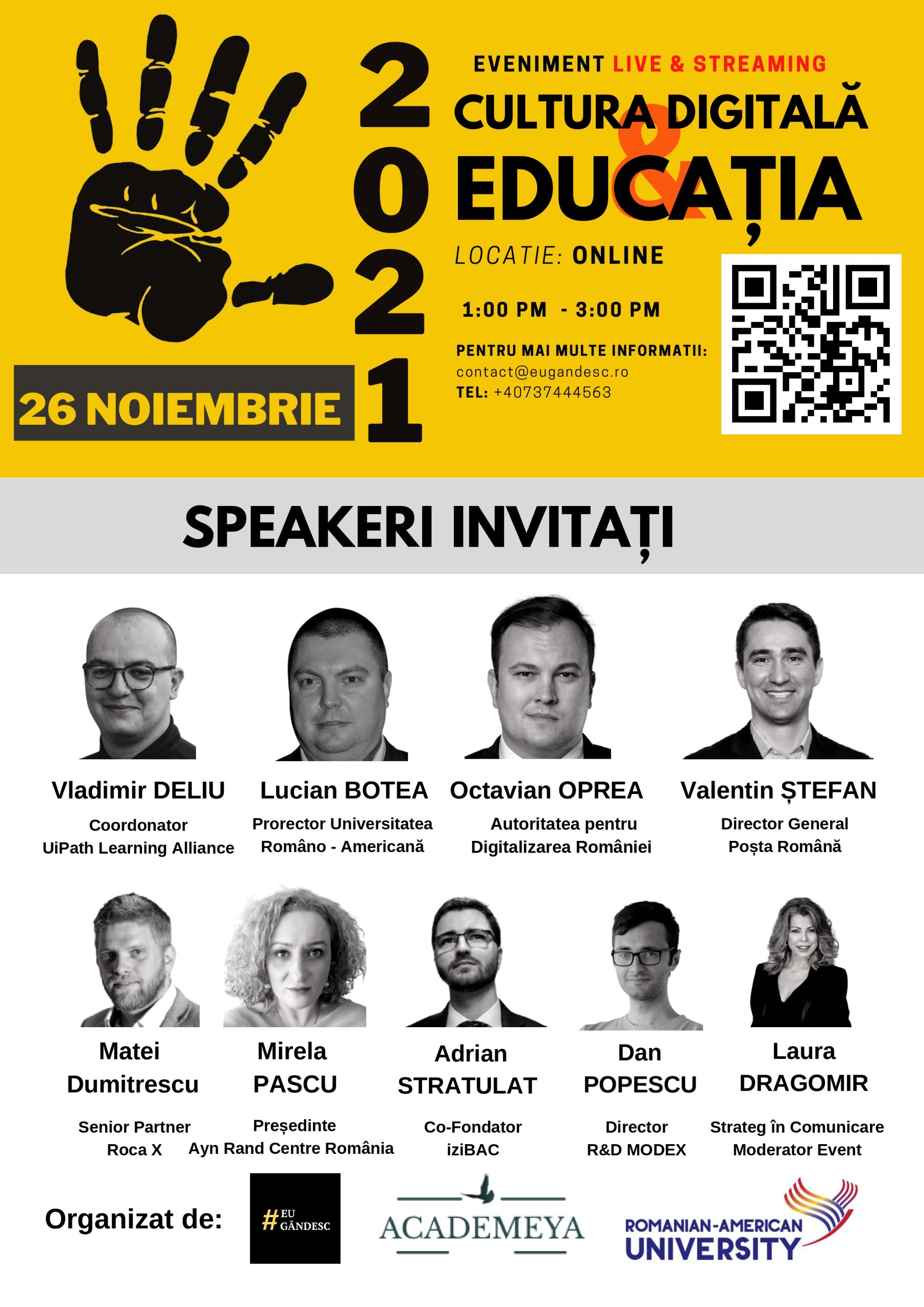 Conferința Cultura Digitală & Educația, organizată de Universitatea Româno-Americană, Academeya și #EuGandesc, are loc vineri, 26 noiembrie.