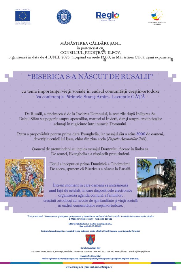 Consiliul Județean Ilfov, în parteneriat cu Mânăstirea Căldărușani, organizează duminică, 𝟰 𝗶𝘂𝗻𝗶𝗲 𝟮𝟬𝟮𝟯, începând cu ora 𝟭𝟯:𝟬𝟬, expunerea „𝗕𝗶𝘀𝗲𝗿𝗶𝗰𝗮 𝘀-𝗮 𝗻𝗮̆𝘀𝗰𝘂𝘁 𝗱𝗲 𝗥𝘂𝘀𝗮𝗹𝗶𝗶”, în cadrul căreia va conferenția Părintele Stareț, Arhimandrit Lavrentie Gâță.