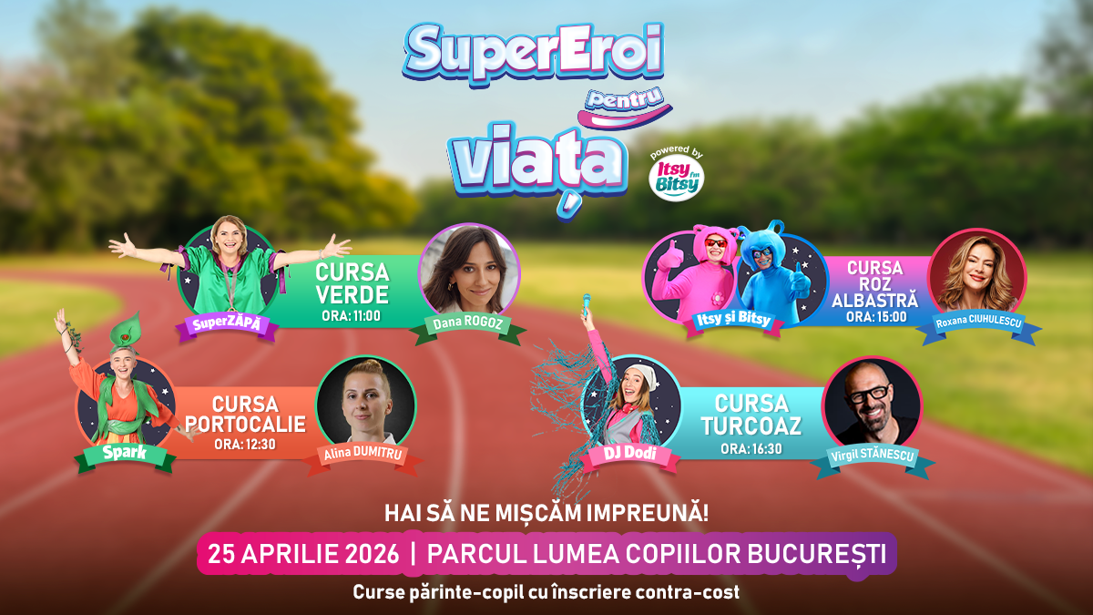 Copiii învață cel mai ușor din exemplul părinților. De aceea, și anul acesta, copiii și părinții sunt așteptați să alerge împreună la Cursele colorate susținute de SuperEroii Itsy Bitsy alături de personalități precum: Dana Rogoz, Roxana Ciuhulescu, Alina Dumitru și Virgil Stănescu, care îi vor încuraja și le vor fi inspirație: