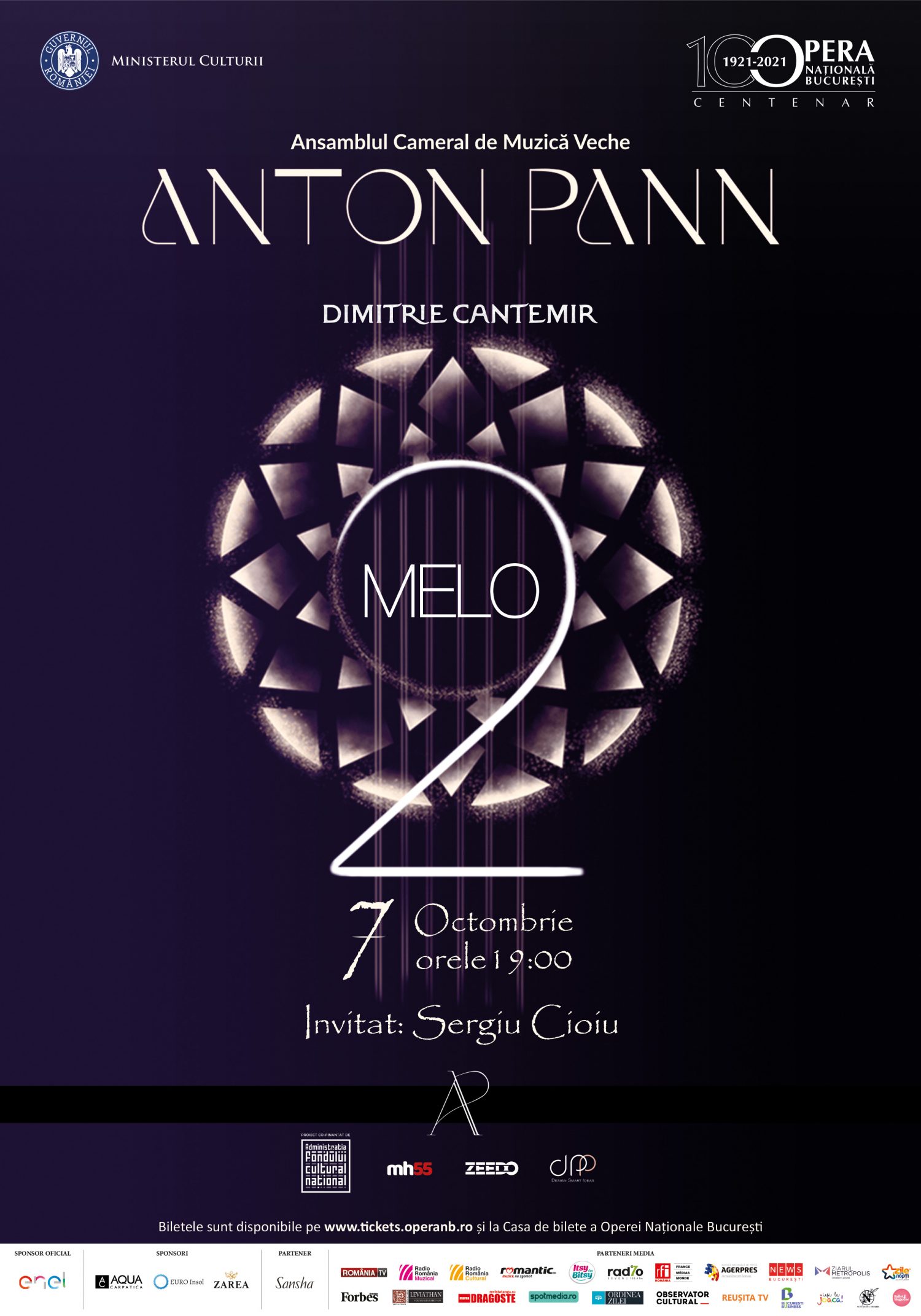 Joi, 7 octombrie, începând cu ora 18:30, pe scena Operei va avea loc concertul „CantemirMelo 2”, susținut de Ansamblul Cameral de Muzică Veche „Anton Pann”. Gândit ca un spectacol de muzică și poezie, pe scena Operei Naționale București vor fi recitate poezii din operele lui Miron Costin, ale Mitropolitului Dosoftei, ale poetului persan Omar Khayyam și ale poetului libanez Khalil Gibran în interpretarea maestrului Sergiu Cioiu și piese atribuite prin tradiție orală principelui Dimitrie Cantemir, preluate o parte din culegerea alcătuită de el însuși și adăugată ca o parte secundă cărții de teorie a muzicii intitulată „Cartea Științei Muzicii după Felul Literelor”, iar altă parte provine din culegerea lui Teodor T. Burada „Scrierile muzicale ale lui Dimitrie Cantemir, domnitorul Moldovei”, republicate în cartea ”Dimitrie Cantemir – Cartea Științei Muzicii” de către Eugenia Popescu- Judetz.