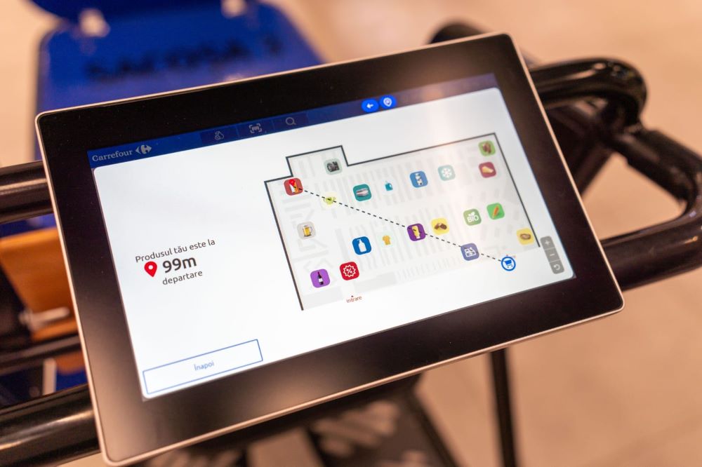 Mai departe, fiecare articol scanat este afişat instantaneu pe ecranul căruciorului, alături de preţ, pentru vizibilitate crescută. De asemenea, în cazul în care clienţii au nevoie de asistenţă, pot solicita ajutor printr-un buton dedicat. Datorită funcţiei de geolocalizare, personalul poate interveni rapid, identificând exact poziţia utilizatorului.