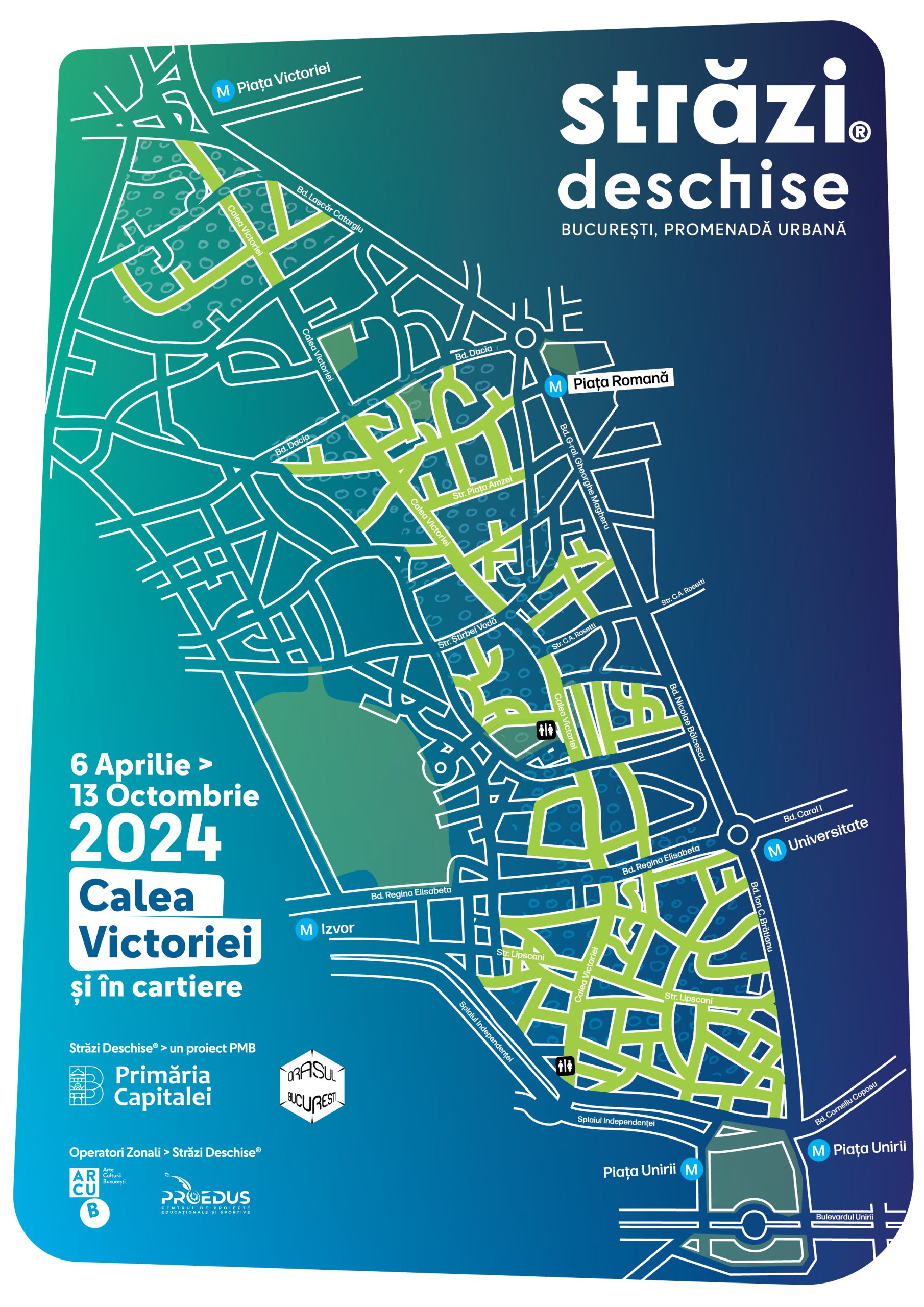 În primul weekend, 6-7 aprilie 2024, Calea Victoriei devine pietonală, între orele 10:00 și 22:00, pe segmentul de drum Piața Victoriei – intersecția cu strada Gheorghe Manu, respectiv segmentul de drum Bulevardul Dacia – Splaiul. Independeţi, fără a afecta intersecţiile.