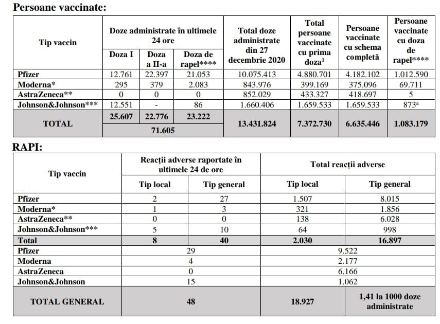 Potrivit CNCAV, de la începutul campaniei de vaccinare anti-COVID, din 27 decembrie 2020, au fost administrate 13.431.824 de doze de vaccin pentru 7.372.730 de persoane, dintre care 6.635.446 au primit schema completă şi 1.083.179 s-au imunizat cu doza a treia.