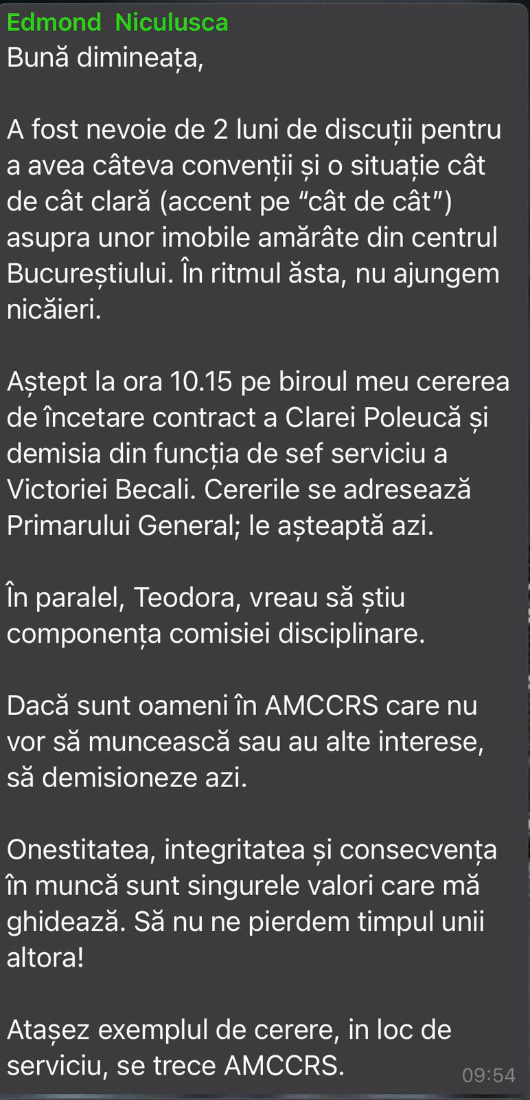 Newsbucuresti.ro a intrat în posesia mesajului menționat de consiliera Primăriei Generale, prin care Edmond Nicușușcă îi cere demisia acesteia și Victoriei Becali.
