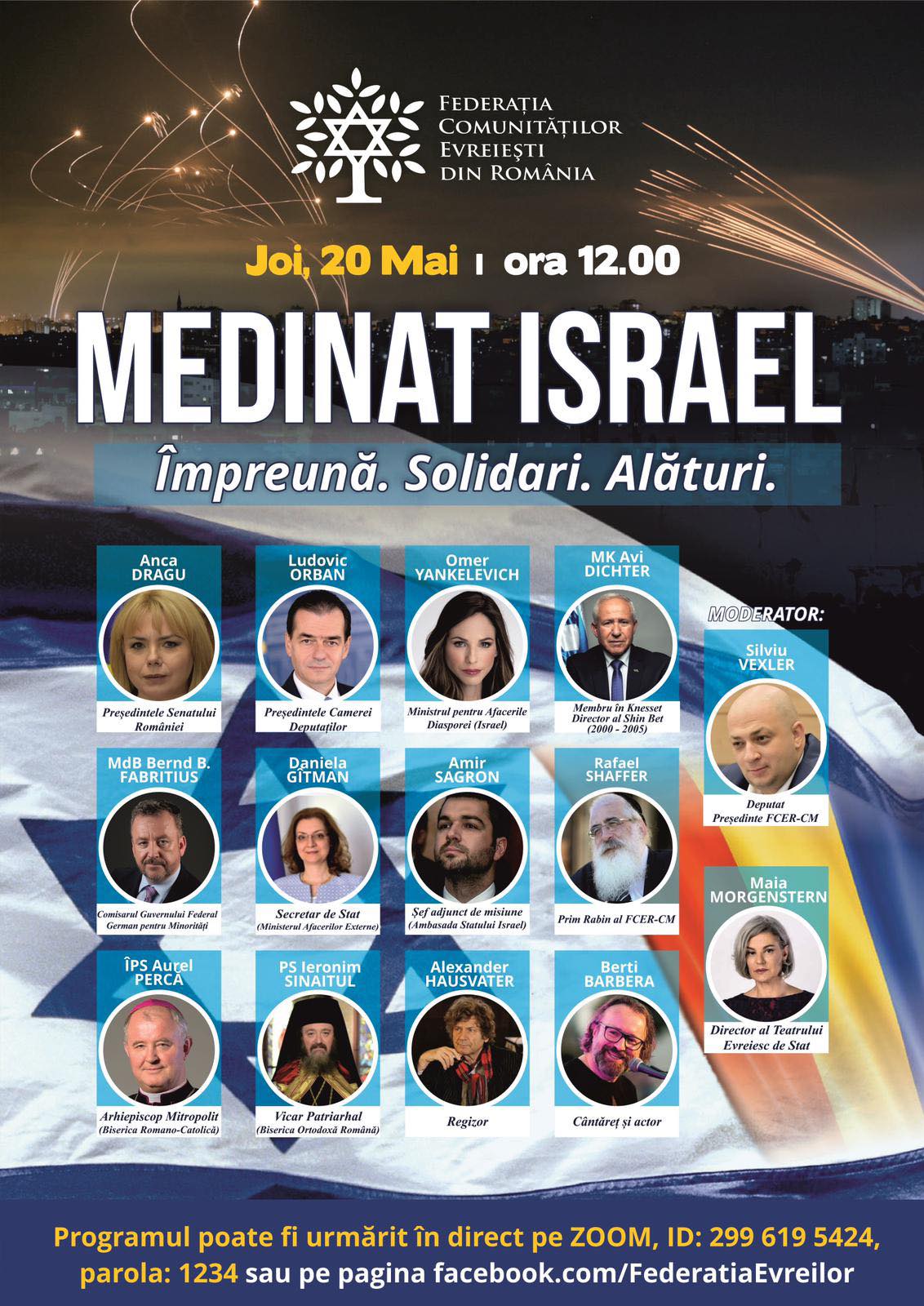 Federația Comunităților Evreiești din România (FCER) organizează astăzi, 20 mai, de la ora 12:00, un eveniment online de susținere a Statului Israel, în contextul situației actuale.