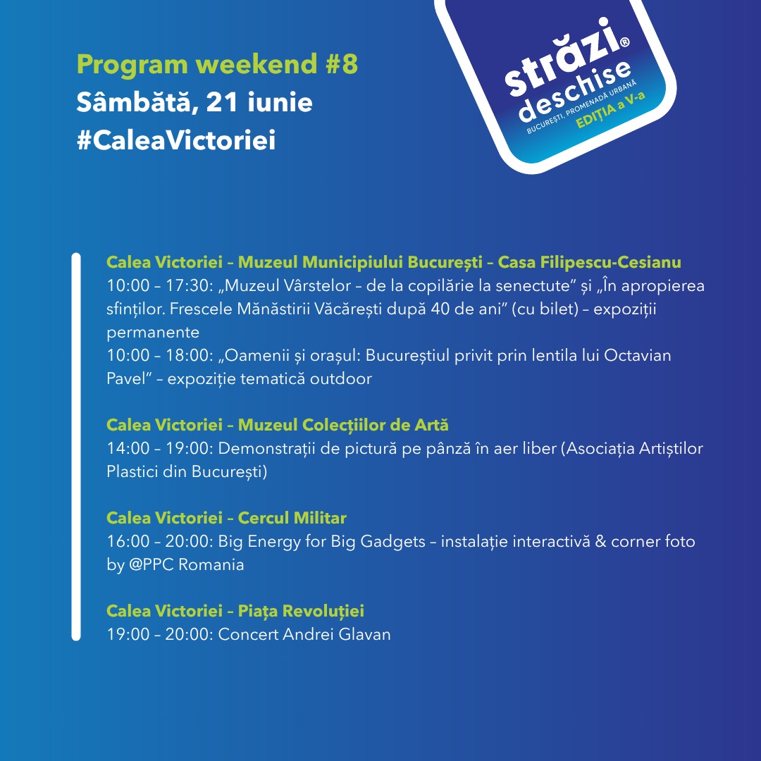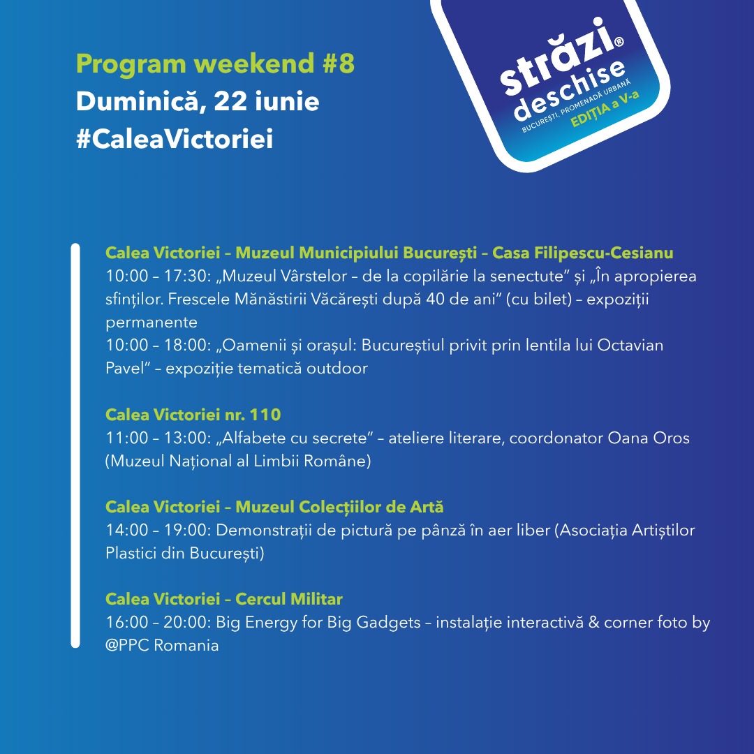 În weekendul 21–22 iunie 2025, Calea Victoriei redevine pietonală și prinde viață cu noi experiențe culturale, artistice și interactive, în cadrul proiectului „Străzi Deschise – București, Promenadă Urbană”, organizat de Primăria Capitalei, prin ARCUB – Centrul Cultural al Municipiului București.
