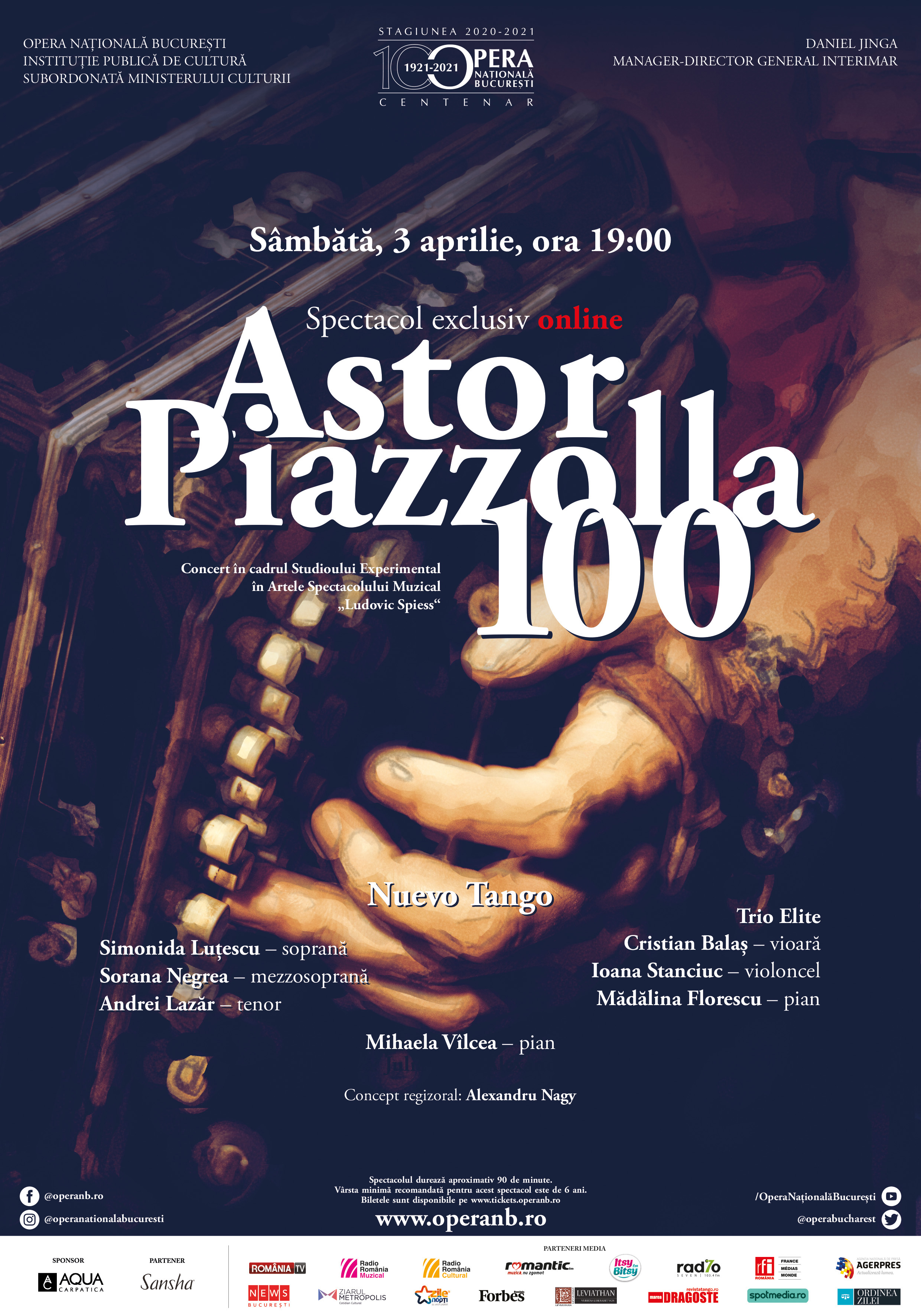 Sâmbătă, 3 aprilie, începând cu ora 19:00, prima scenă lirică a țării transmite online concertul „Astor Piazzolla 100”, o incursiune în lumea magică, plină de mister și senzualitate a creației lui Astor Piazzolla, cel care a revoluționat tangoul tradițional argentinian, creând „Tango nuevo” și de la a cărei naștere aniversăm în luna martie 100 de ani. Reprezentația spectacolului a fost înregistrată în 5 martie 2021. Biletele se pot achiziționa de pe https://tickets.operanb.ro/ până luni, 5 aprilie, ora 19:00.