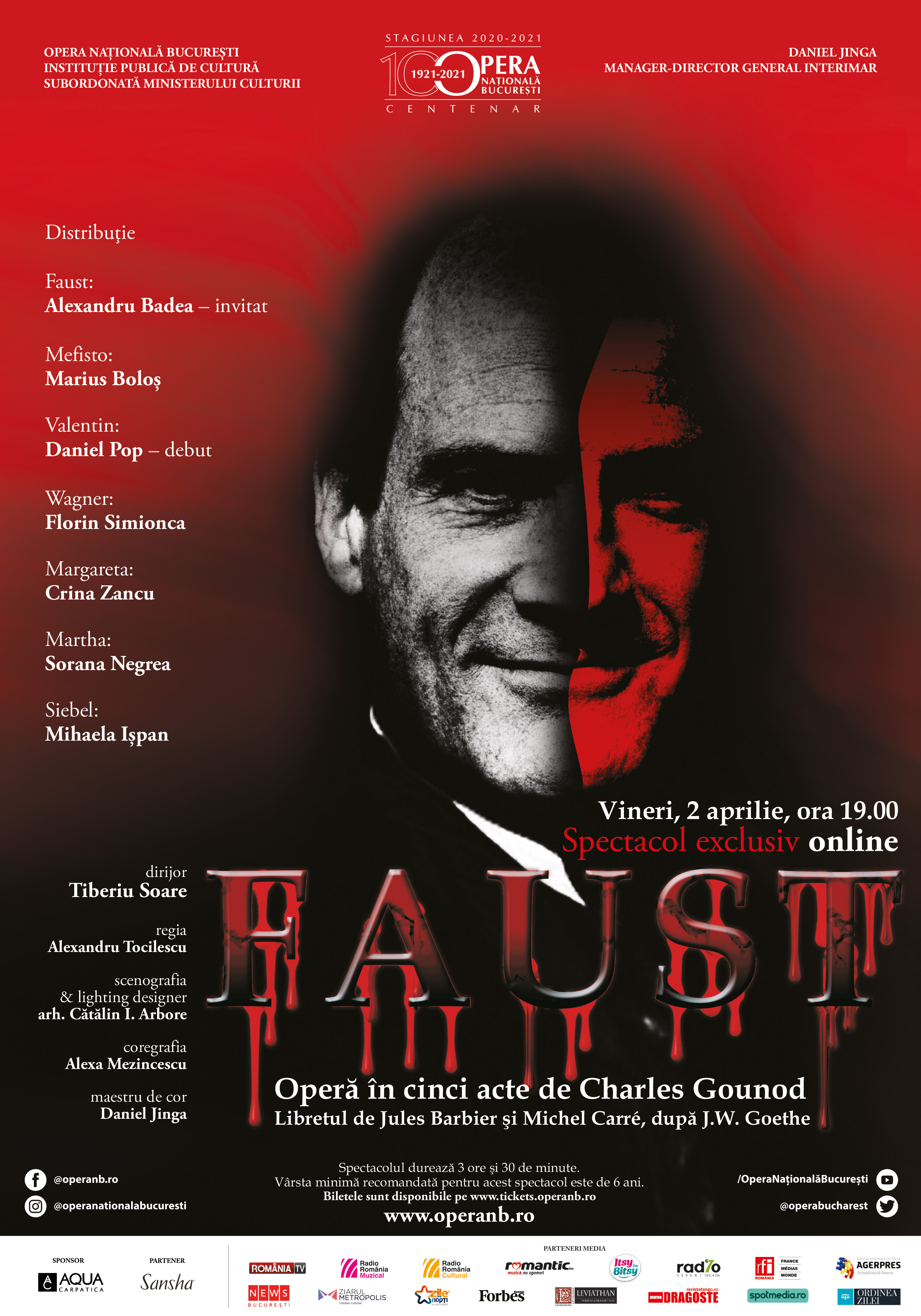 Vineri, 2 aprilie, începând cu ora 19:00, Opera Națională București transmite online spectacolul de operă „Faust” de Charles Gounod. Reprezentația spectacolului a fost înregistrată în 17 ianuarie 2019. Biletele se pot achiziționa de pe https://tickets.operanb.ro/ până duminică, 4 aprilie, ora 19:00.