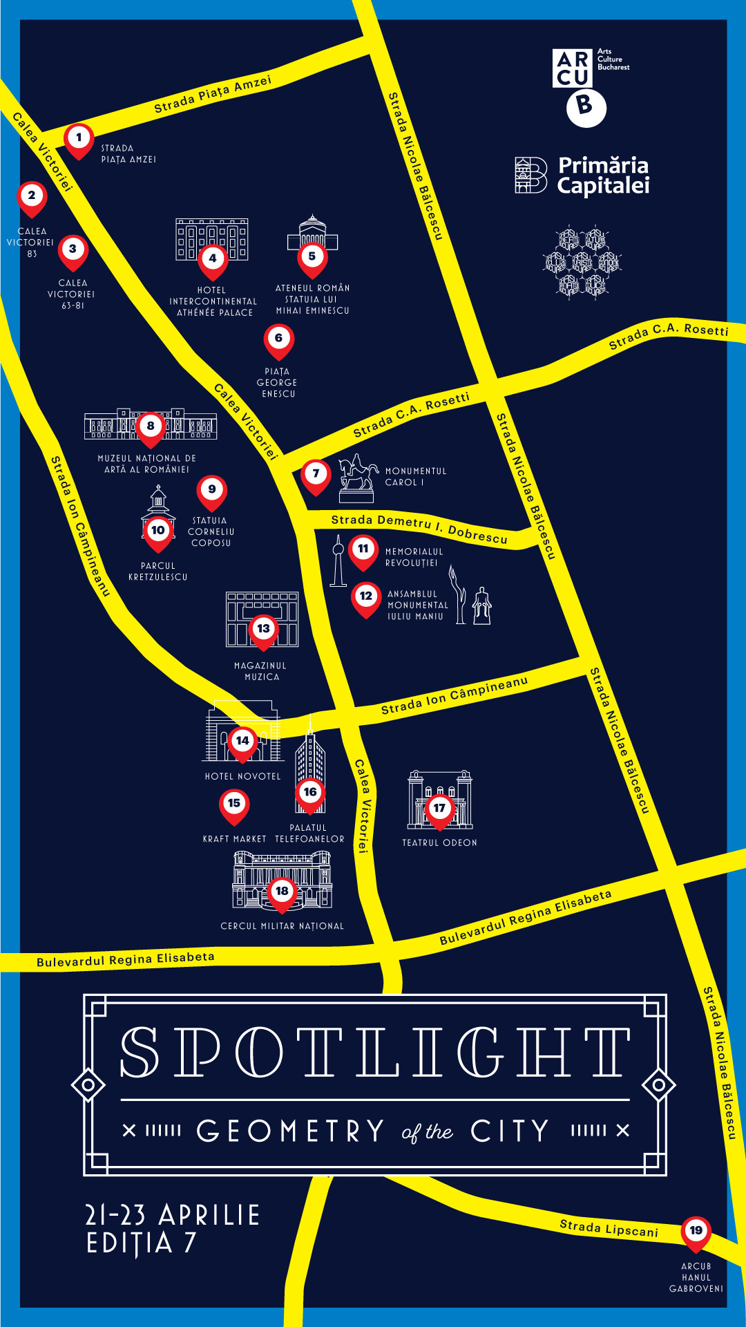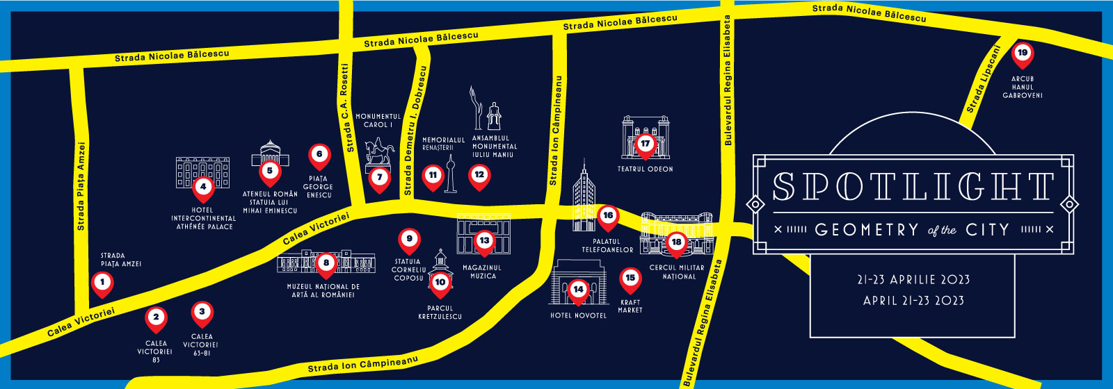 Spotlight Festival #7 – Geometry of the City se desfăşoară în 21 şi 23 aprilie 2023, pe Calea Victoriei (între strada Piaţa Amzei şi Cercul Militar Naţional) şi la ARCUB – Hanul Gabroveni, în intervalul orar 20.00-23.00Accesul este liber. Informaţii despre ediţia din acest an, harta Spotlight, detalii despre artiştii ediţiei, instalaţiile şi proiecţiile de video mapping sunt disponibile pe spotlightfestival.ro .